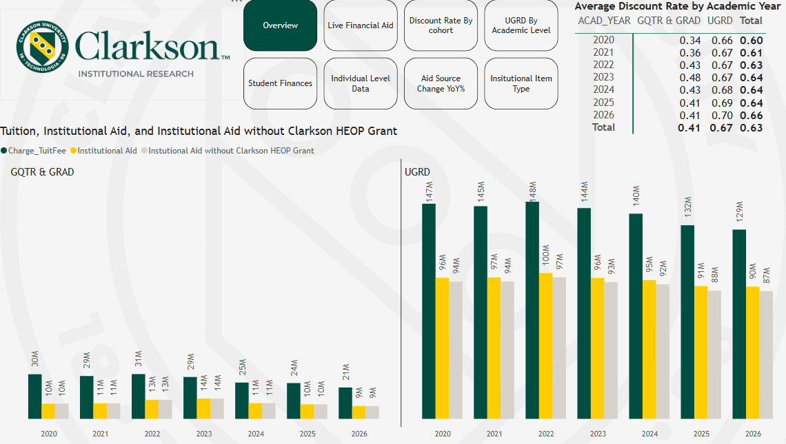This section is in progress, with more dashboards coming soon. If you have any suggestions for future dashboards, or if you find that a dashboard below is no longer updating, please reach out to us at ir@clarkson.edu.
